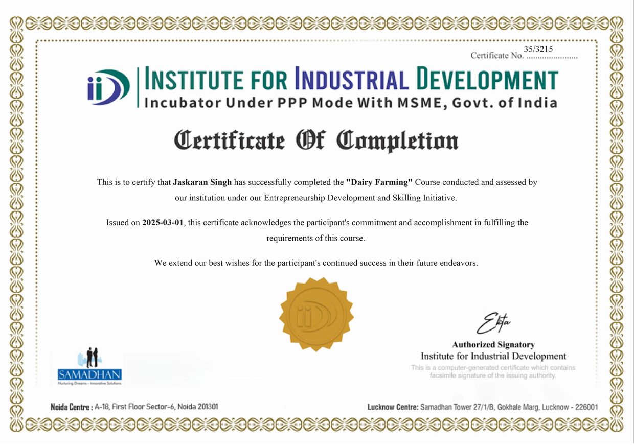 From milking to packaging, every step is supervised by trained professionals under hygienic conditions. We maintain transparent farm practices — so our customers know exactly where their milk comes from and how it’s processed. At Jaskaran Dairy Farms, our certifications aren’t just documents — they’re a symbol of trust, purity, and excellence.